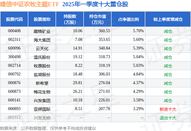 从基金规模来看,建信中证农牧主题ETF基金2025年一季度公布的基金规模为0.63亿元,较上一期规模7125.16万元变化了-804.47万元,环比变化了-11.29%。该基金最新一期资产配置为:股票占净值比98.86%,无债券类资产,现金占净值比1.8%。从基金持仓来看,该基金当季前十大股票仓位达47.13%金富宝,第一大重仓股为藏格矿业(000408),持仓占比为5.7%。
