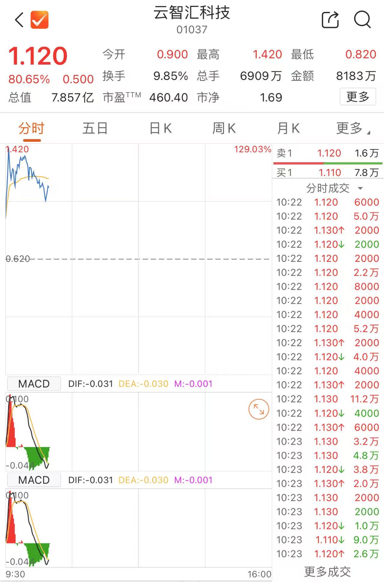 上证报中国证券网讯(记者 严晓菲)在前一日大幅收涨后,港股云智汇科技23日继续走强。开盘后不久,云智汇科技一度飙涨超125%,随后涨幅有所收窄。截至发稿,该公司股价涨幅仍超过80%。