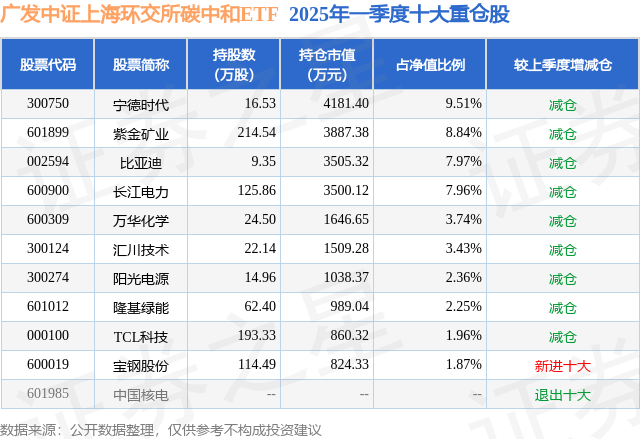 从基金规模来看,广发中证上海环交所碳中和ETF基金2025年一季度公布的基金规模为4.4亿元,较上一期规模4.77亿元变化了-3671.25万元,环比变化了-7.7%。该基金最新一期资产配置为:股票占净值比99.01%,无债券类资产,现金占净值比1.06%。从基金持仓来看,该基金当季前十大股票仓位达49.89%,第一大重仓股为宁德时代(300750),持仓占比为9.51%。